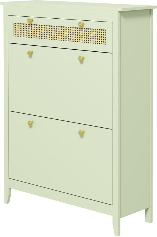 De compacte en stijlvolle schoenenkast met lade van , speciaal ontworpen voor krappe ruimtes, kan tot 12 paar schoenen opbergen. De flexibele kantelschuifladen met verstelbare planken in het schoenenrek maken het eenvoudiger om verschillende schoenmaten te organiseren. De elegante rotanstrip op de lade van de schoenenopslag voegt daarnaast een opvallend accent toe.