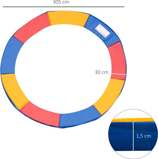 Veilig, duurzaam en eenvoudig aan te brengen. Onze -randafdekking is, ongeacht de fabrikant, geschikt voor gangbare trampolines met een diameter van Ø366 cm. De EPE-vulling bedekt de spiraalveren op veilige wijze en beschermt je kinderen tegen verwondingen. Met de duurzame lussen is hij eenvoudig aan het frame van je trampoline te bevestigen. Zo vervang je eenvoudig je oude randafdekking. OPMERKING: Meet vooraf je trampoline en de lengte van de schroefveren op, om een verkeerde bestelling te voorkomen. Voor lange schroefveren heb je wellicht een bredere hoes nodig.
