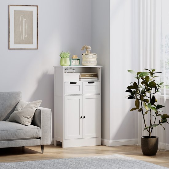 Breid uw opbergruimte uit met de elegante badkamerkast van . Gemaakt van hoogwaardig MDF en in een zacht wit afgewerkt, combineert dit badkamermeubel stabiliteit en stijl. Met een open vak, twee handige laden en een ruim kastvak met verstelbare plank biedt de bijzetkast ruimte voor al uw badkamerbenodigdheden - van zeep tot handdoeken. Veelzijdig in gebruik, kan het ook dienen als een stijlvolle boekenkast in de woonkamer. Geniet van orde en elegantie in uw huis!
