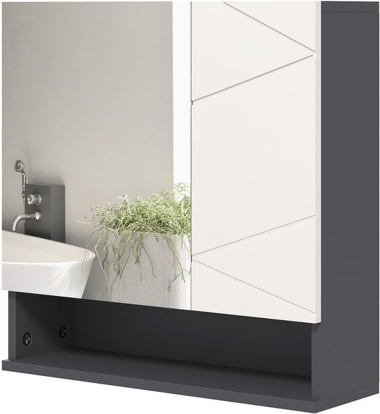 Geef uw ruimte een subtiele, stijlvolle touch met . Deze donkergrijze badkamerwandkast met lichtgrijze deuren en reliëflijnen heeft een uniek karakter. Uitgerust met een spiegelkast, een zijkast en een onderplank, beide kasten hebben een legplank die in drie richtingen verstelbaar is. Minimalistische stijl, subtiel uitgevoerd.