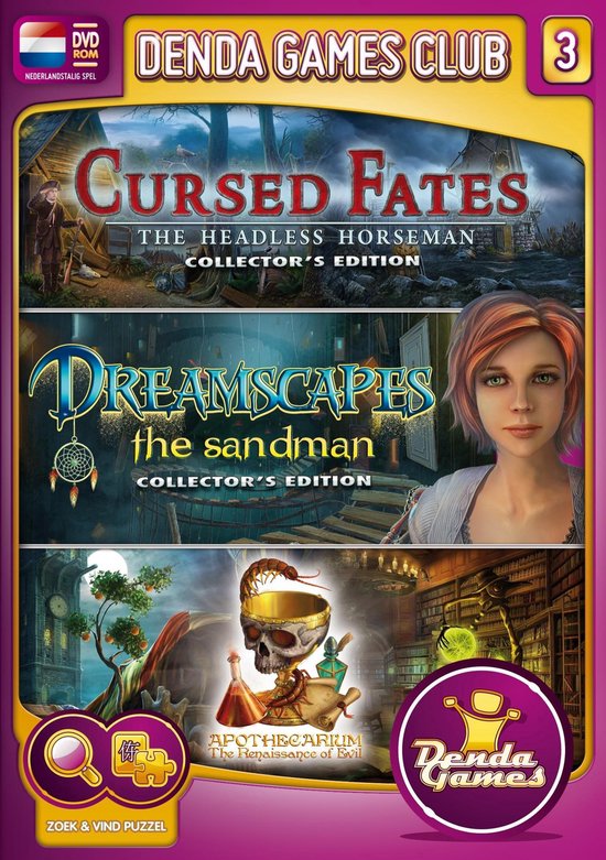 De Denda Casual Games Club 3 bevat: CURSED FATES, THE HEADLESS HORSEMAN (COLLECTORS EDITION): Een ruiter zaait paniek in Cursed Fates, The Headless Horseman (Collectors Edition). Help de inwoners van Sleepy Hollow om de vloek te verbreken. Het is 1799. In het noordelijkste puntje van de staat New York ligt het kleine stadje Sleepy Hollow. Zoals zo vaak het geval is, herbergt ook dit kleine oord een groot mysterie. Een geheim huwelijk en een nieuw testament hebben een vloek over het stadje afgeroepen. Ontdek welke verschrikkelijk legende werkelijkheid is geworden en geniet van fantastische extras in dit spannende spel. Ga de strijd aan met het bovennatuurlijke en voer opdrachten uit voor burgers. Durf jij het op te nemen tegen de hoofdloze ruiter? DREAMSCAPES, THE SANDMAN (COLLECTORS EDITION): Een meisje zit gevangen in haar nachtmerries en heeft je hulp nodig in Dreamscapes, The Sandman (Collectors Edition), een griezelig zoek en vind avontuur. Reis door haar Lauras geest en ontdek waarom ze niet ontwaakt uit haar coma. Zoek naar nuttige voorwerpen, los puzzels op en vind alle delen van de dromenvanger. Deze Collectors Edition bevat prachtige extras en laat je optimaal van dit bijzondere spel genieten. Raadpleeg de handige spelgids als je hulp nodig hebt en speel een fantastisch bonushoofdstuk. Kun jij Laura uit haar hachelijke situatie bevrijden? Hou de omgeving goed in de gaten. Als je onvoorzichtig bent staat je hetzelfde lot als Laura te wachten APOTHECARIUM, THE RENAISSANCE OF EVIL (COLLECTORS EDITION) Wat is de bron van het oneindige kwaad dat Italie in zijn greep heeft? Ga op zoek naar de oplossing in Apothecarium, The Renaissance of Evil (Collectors Edition). In de Middeleeuwen heft een onbekende ziekte veel kwaad en verdriet gezaaid in het mooie Italie. Zoek de remedie tegen deze vreselijke ziekte in dit spannende zoek en vind avontuur. Er bestaat een legende van een mythisch dorp waar het geheim om de ziekte te doen verdwijnen verborgen zou zijn een dorp met de naam Apothecarium, gesticht door Italies meest vooraanstaande wetenschappers. Veel mensen horen ervan en vluchten naar de stad Apothecarium in de hoop genezen te worden, maar een mysterieuze man ontneemt hen de kans op overleven.