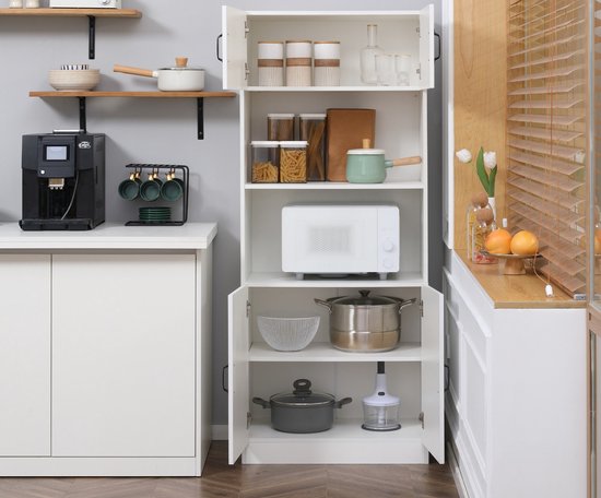 2. Meer opbergruimte: De 4 planken van deze hoge kast bieden veel ruimte voor servies, potten, voedsel of plastic bakken. In het open midden kunnen keukentoestellen zoals magnetron of koffiezetapparaat worden geplaatst. Achter de 4 deuren heerst orde en is de inhoud beschermd tegen stof. Voor grotere items kunt u de verstelbare planken in de onderkast aanpassen aan uw behoeften.