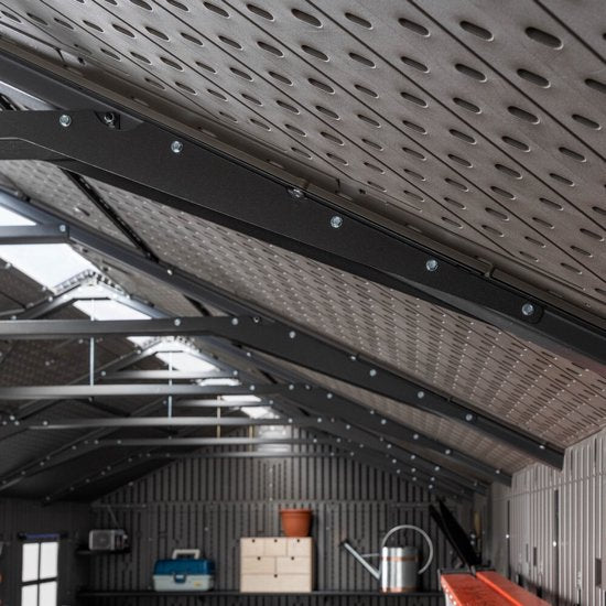 De De schuur krijgt zijn enorme stabiliteit dankzij de constructie van dubbelwandig, metaalversterkt HDPE-kunststof (hard polyethyleen). De dakconstructie van hoogwaardig staal is bestand tegen hoge sneeuwbelastingen en door de ideale dakhelling kunnen water en sneeuw bovendien snel wegvloeien.
