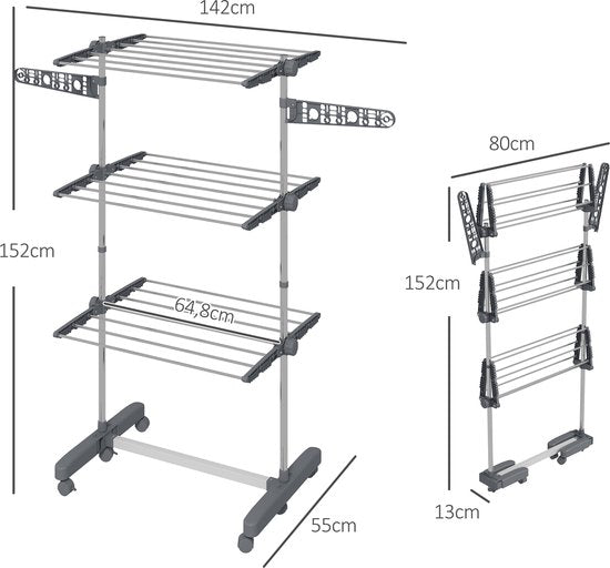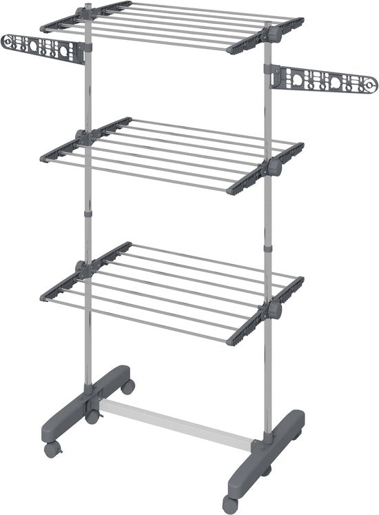 Ruim droogrek op wielen. Het combineert hoge kwaliteit, gebruiksgemak en ruimtebesparing in één. Verrijdbaar droogrek die ook nog eens half gebruikt kan worden als je minder ruimte hebt. Met zes wielen en remmen is de wasdroger praktisch en mobiel.