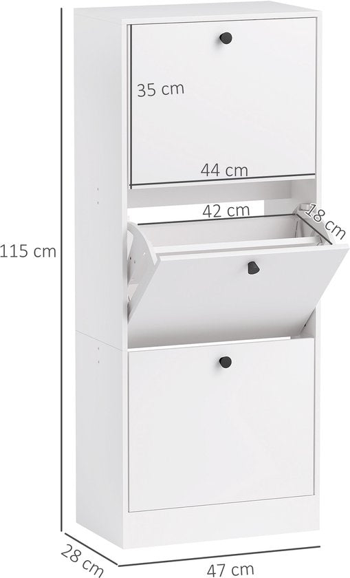Geef uw hal elegantie en orde met de schoenenkast. Het slanke ontwerp van de schoenenkast met zwarte ronde handvatten en drie klapvakken biedt plaats aan tot wel 12 paar schoenen. Ideaal voor smalle ruimtes, de opbergruimte kan individueel aangepast worden met drievoudig verstelbare planken. Stijlvolle opberging voor elk huis!