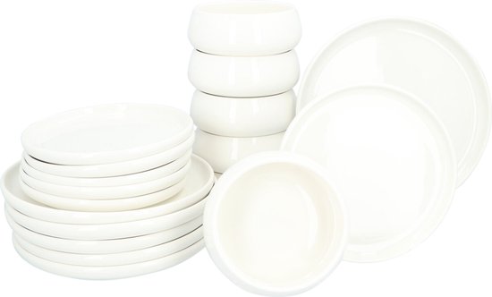 Als je zoekt naar een mooi wit servies wat onderscheidend is, dan heb je het nu gevonden! Dit servies biedt is uitgevoerd voor zes personen en bevat alles wat je nodig hebt voor een complete maaltijd: dinerborden, ontbijtborden en kommen. De glanzende glazuurlaag op het servies maken het een tijdloos en duurzaam servies en heeft een mooi moderne uitstraling, zeker in combinatie met de opstaande rand. Het servies is vaatwasser en magnetron geschikt. De kom is niet alleen handig voor pasta of soep maar ook ideaal voor een joghurt ontbijt met meusli of vers fruit.
