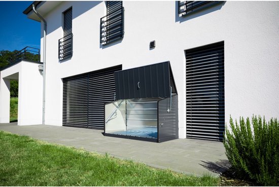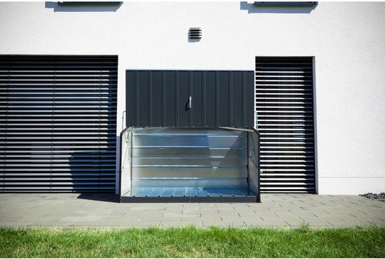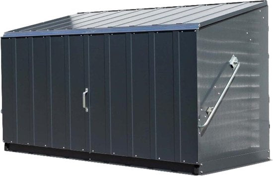 De Trimetals opbergbox is gemaakt van hoogwaardig, PVC gecoat en gegalvaniseerd staal en is bijzonder weerbestendig, gemakkelijk schoon te maken en zelfs brandwerend. De grote opening met gasveren zorgt voor een gemakkelijke en veilige opslag van fietsen en tuinspullen.