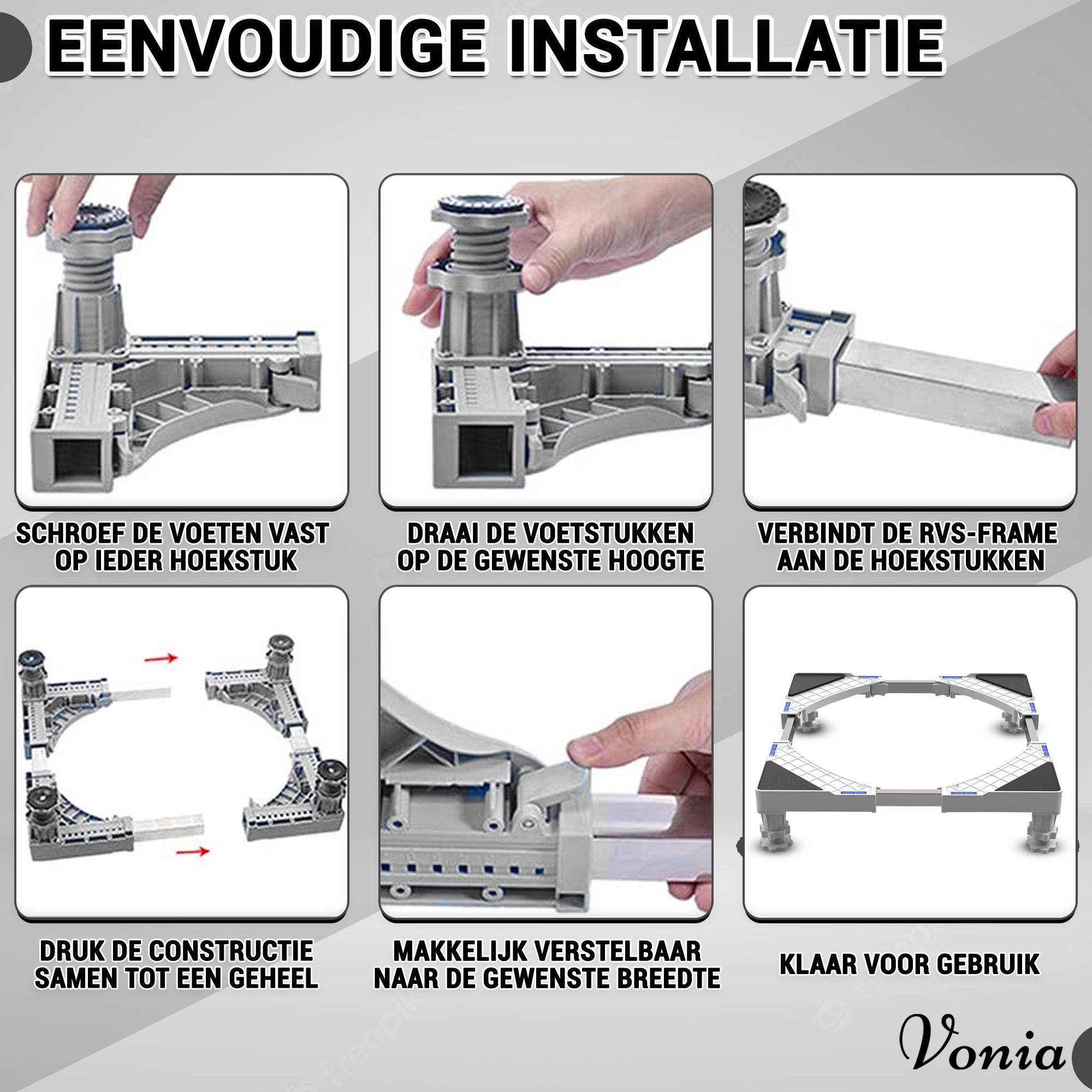 De basis van de wasmachineverhoger is gemaakt van roestvrijstalen buizen en sterk polypropyleen plastic. De hoekstukken van de verhoger zijn extra stevig en duurzaam en hebben een formaat van 22 x 22 cm. Om glijden te voorkomen is de verhoger voorzien van anti-slip oppervlakken in de hoeken. Deze oppervlakken vangen ook gelijk het geluid en de trillingen tijdens het wassen en drogen op.