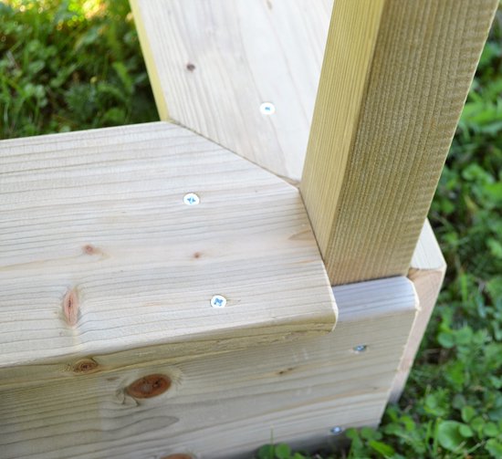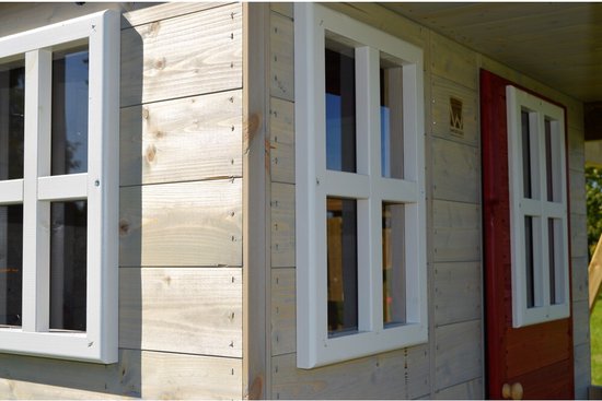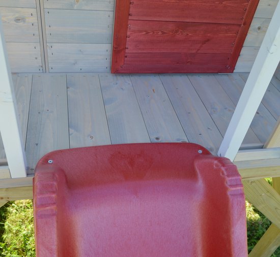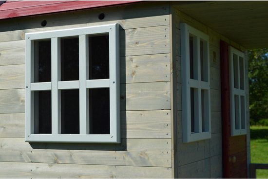 Het tuinspeelhuis is gemaakt van hout uit duurzame bosbouw en wordt geaccentueerd door de rode details en witte decoratieve elementen. De veiligheid van uw kinderen wordt gegarandeerd door de hoogwaardige afwerking en de afgeronde randen.