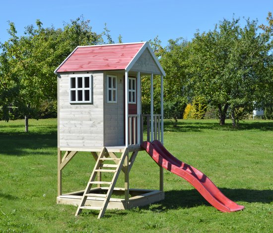 Het kleuterhuis met veel speelse en moderne details is ideaal voor kinderen tussen 3 en 7 jaar oud. Het speelhuis biedt voldoende ruimte om rond te rennen en voldoende mogelijkheden om je terug te trekken. De kinderen kunnen hun fantasie de vrije loop laten en optimaal genieten van de veranda met glijbaan. Het speelhuis is goed beschermd tegen weersinvloeden doordat het geen openstaande ramen of deuren heeft.