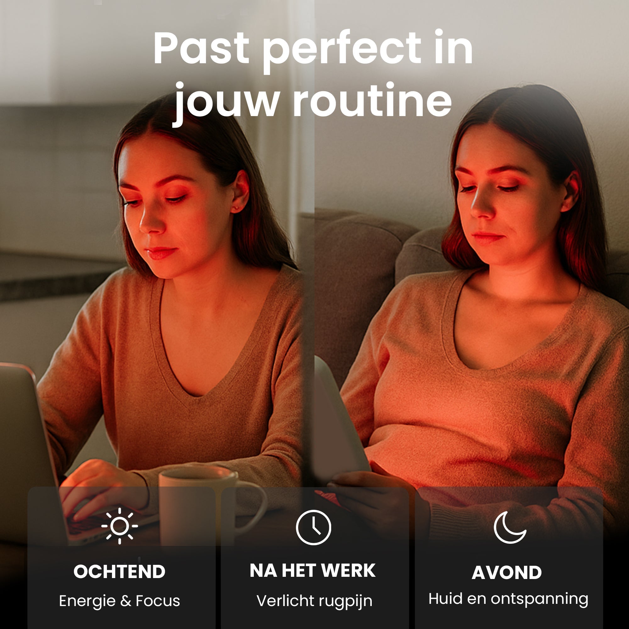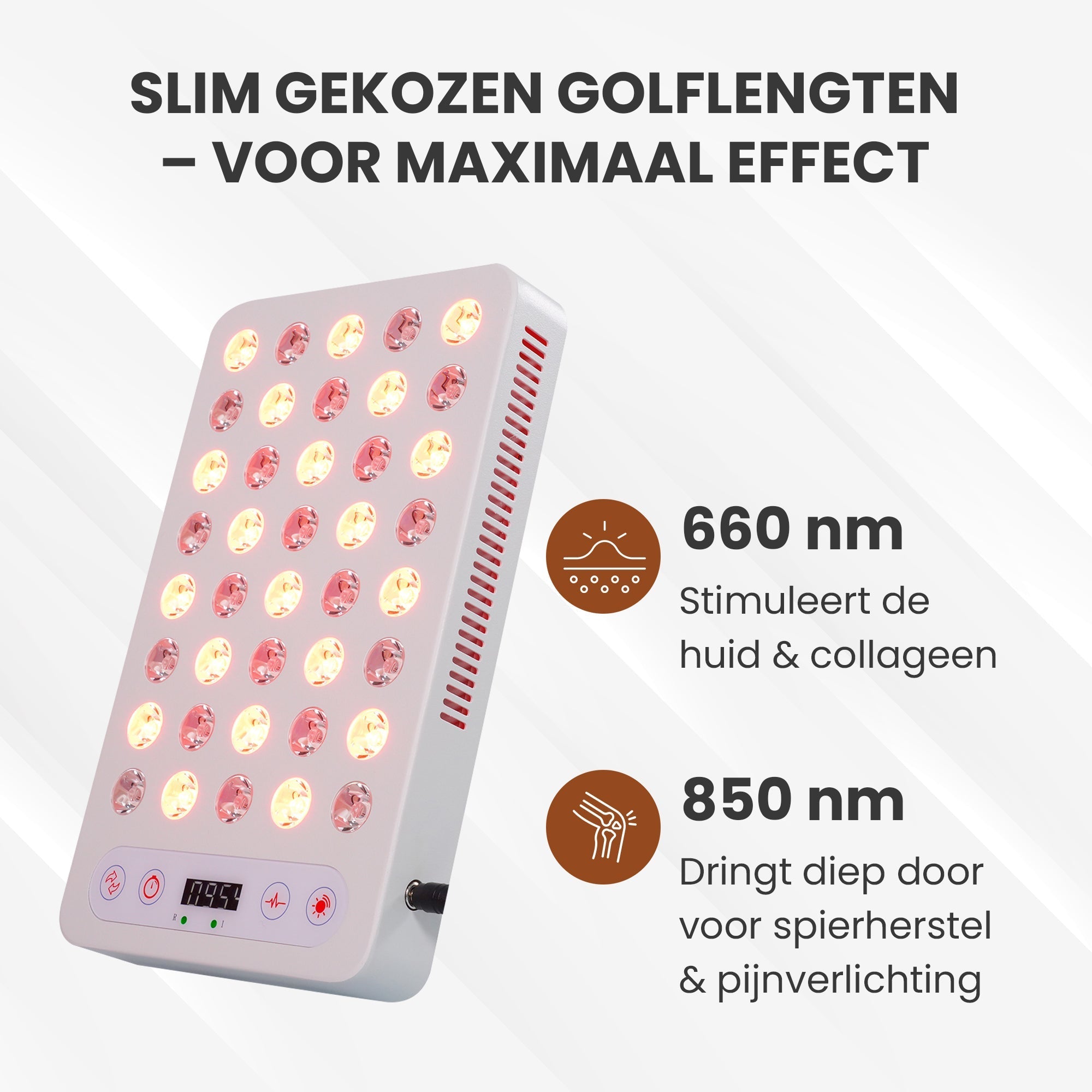 850 nm nabij-infrarood licht – Dringt dieper door in spieren, gewrichten en weefsels om pijn te verlichten, ontstekingen te verminderen en de doorbloeding te verbeteren.
