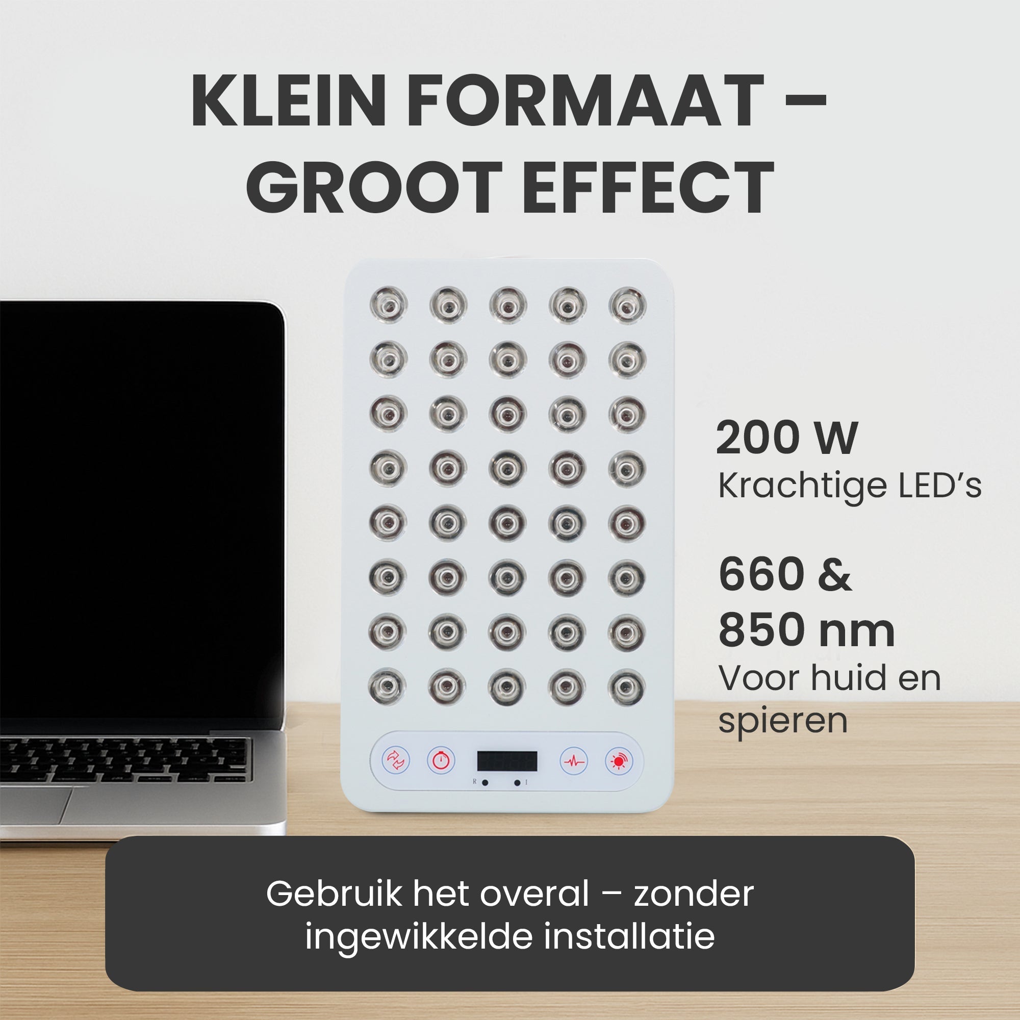 Met een vermogen van 200W en een intensiteit van 219 mW/cm² op 7,5 cm afstand levert de Mvolo Elite Series 106 krachtige resultaten in een compact formaat. De ingebouwde pulse-modus zorgt voor een diepere cellulaire respons, terwijl de instelbare timerfunctie in stappen van 5 minuten zorgt voor nauwkeurige behandelsessies. Het apparaat wordt geleverd met een veiligheidsbril en duidelijke instructies, zodat je direct veilig aan de slag kunt.