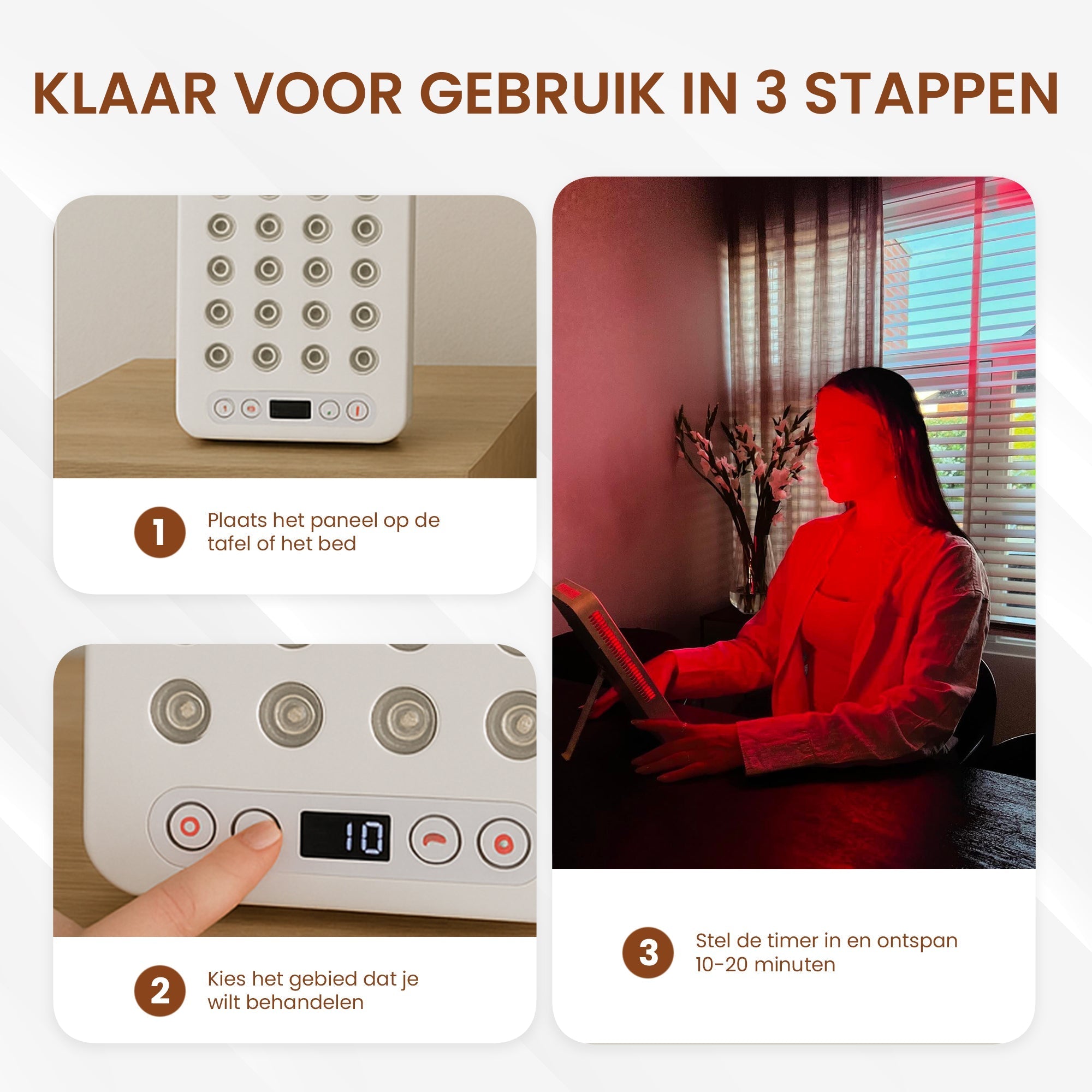 Dagelijks gebruik is veilig. Aanbevolen wordt 10–20 minuten per behandelzone, afhankelijk van de klacht.