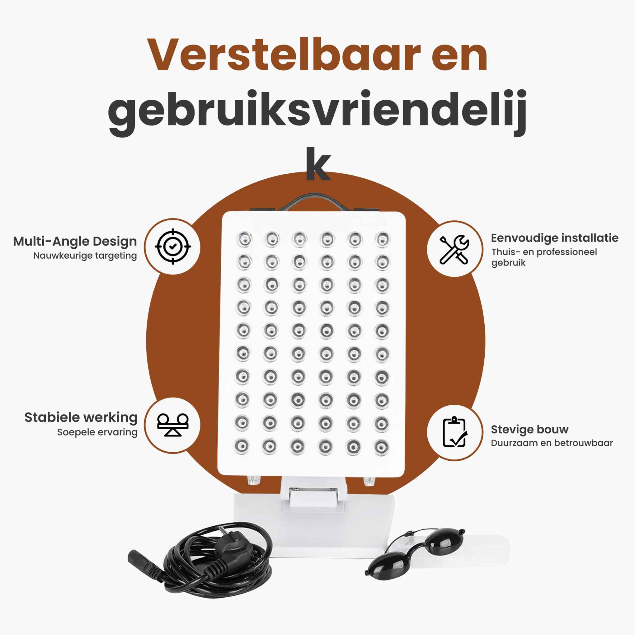 - 6 golflengten: 630 nm, 660 nm, 670 nm, 810 nm, 830 nm, 850 nm