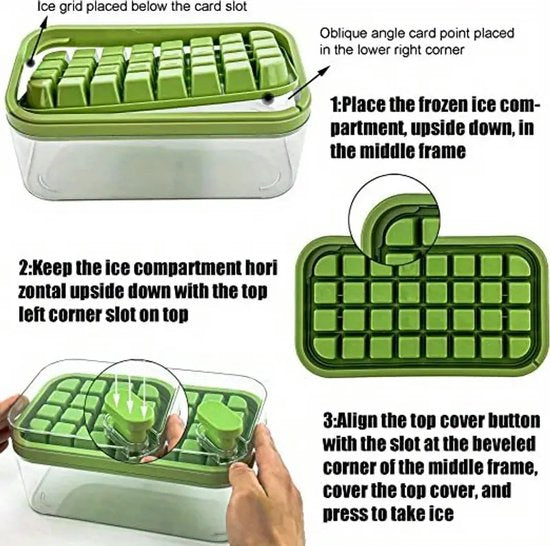De ijsblokjesvorm met bakje en deksel biedt een slimme en praktische oplossing voor het maken, druk op de knop van de deksel en alle blokjes komen er makkelijk uit. Geniet van koele en verfrissende drankjes met deze ijsblokjes vorm.