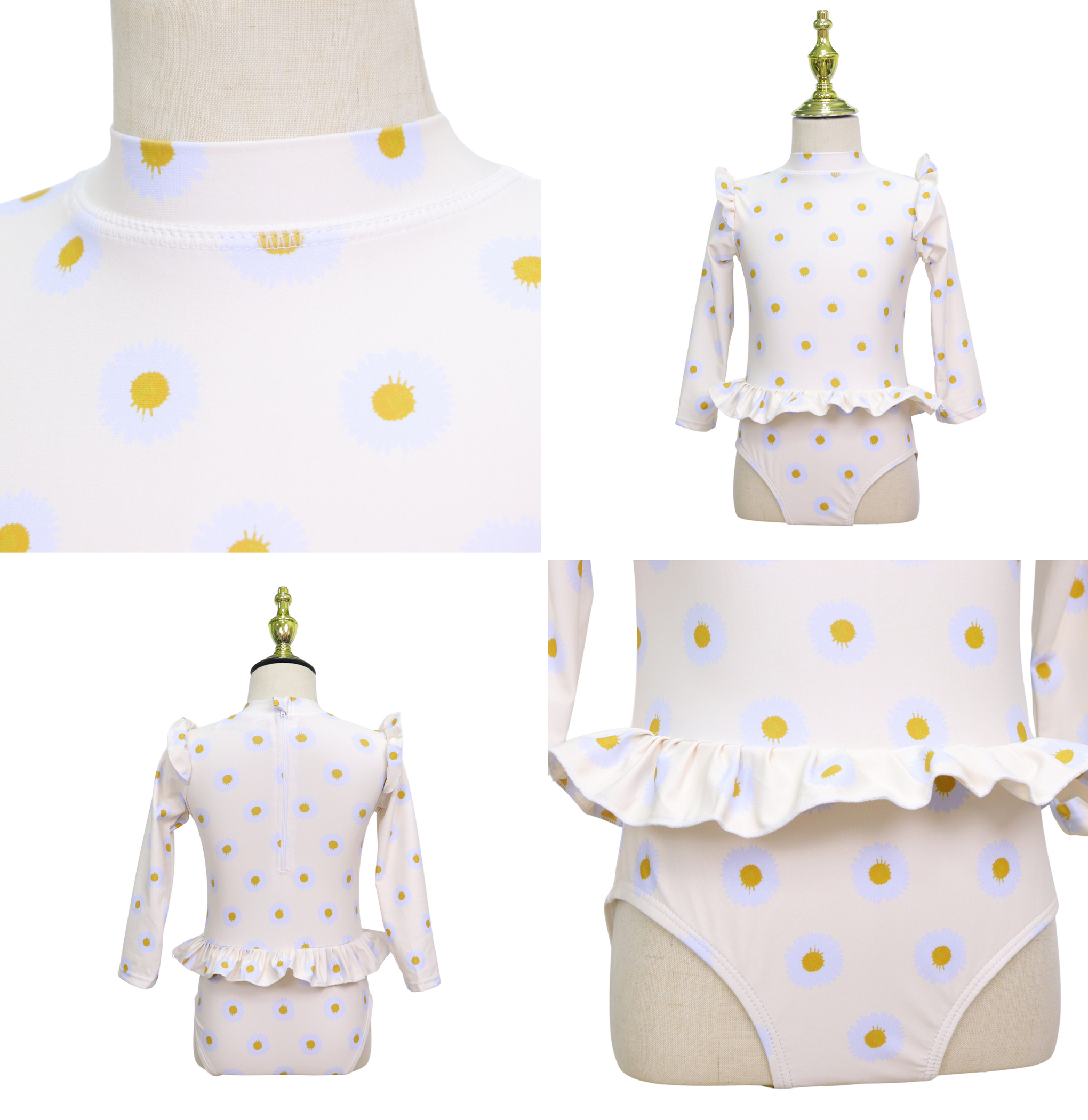 Joya Kids® UV-Beschermend Badpak Baby – Langemouwen Zwempak Meisje – Gebroken Wit met Bloemen print met Roesjes rond Middel en Mouwen – Van 2 tot 8 Jaar oud