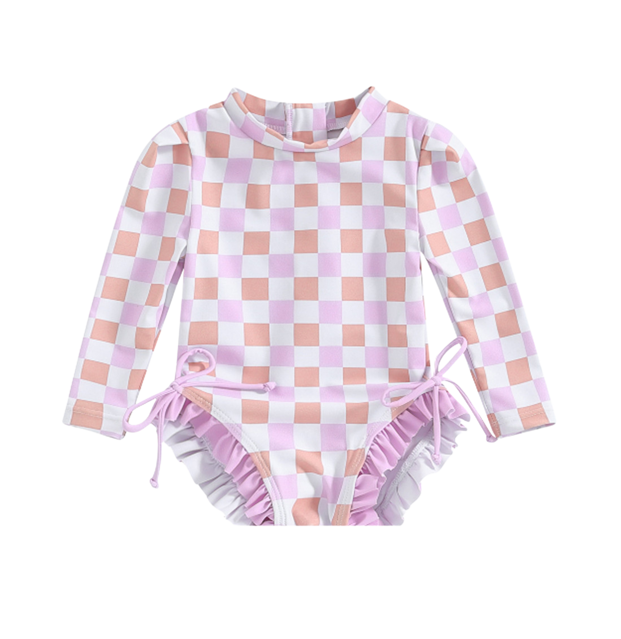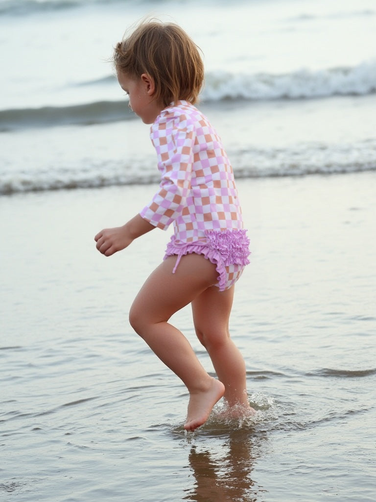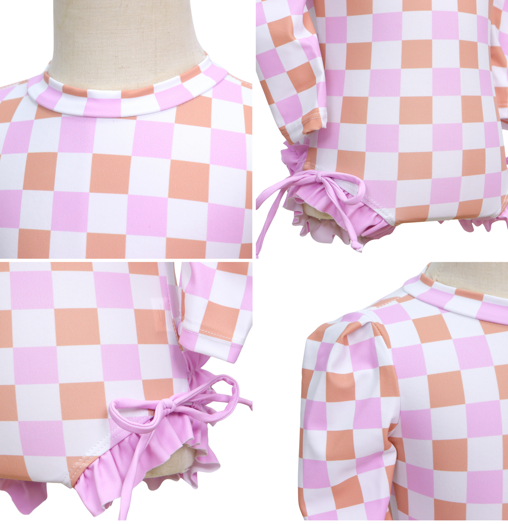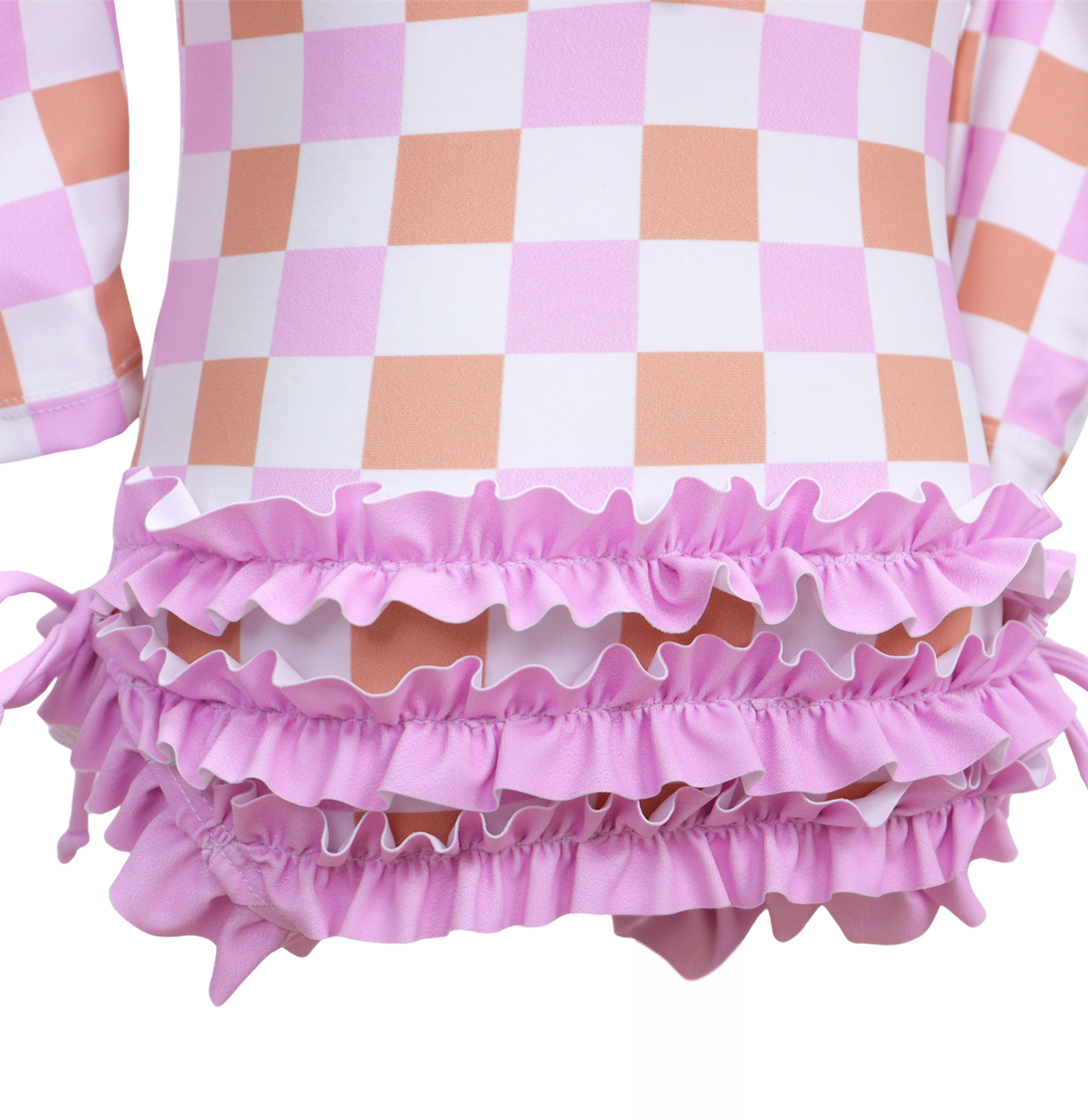 Badpak Lange Mouw Lila, Roze en Wit Geblokt met Ruches en Strikjes Meisjes