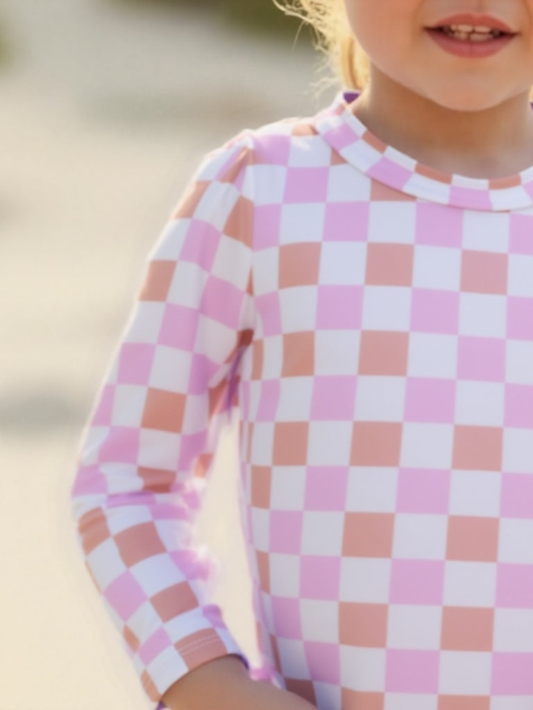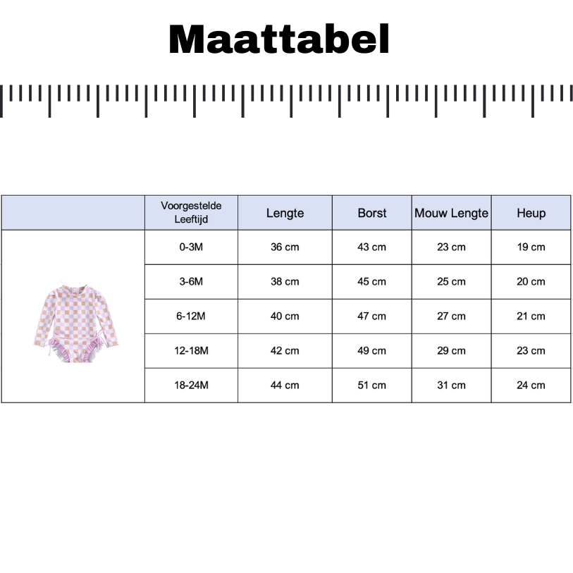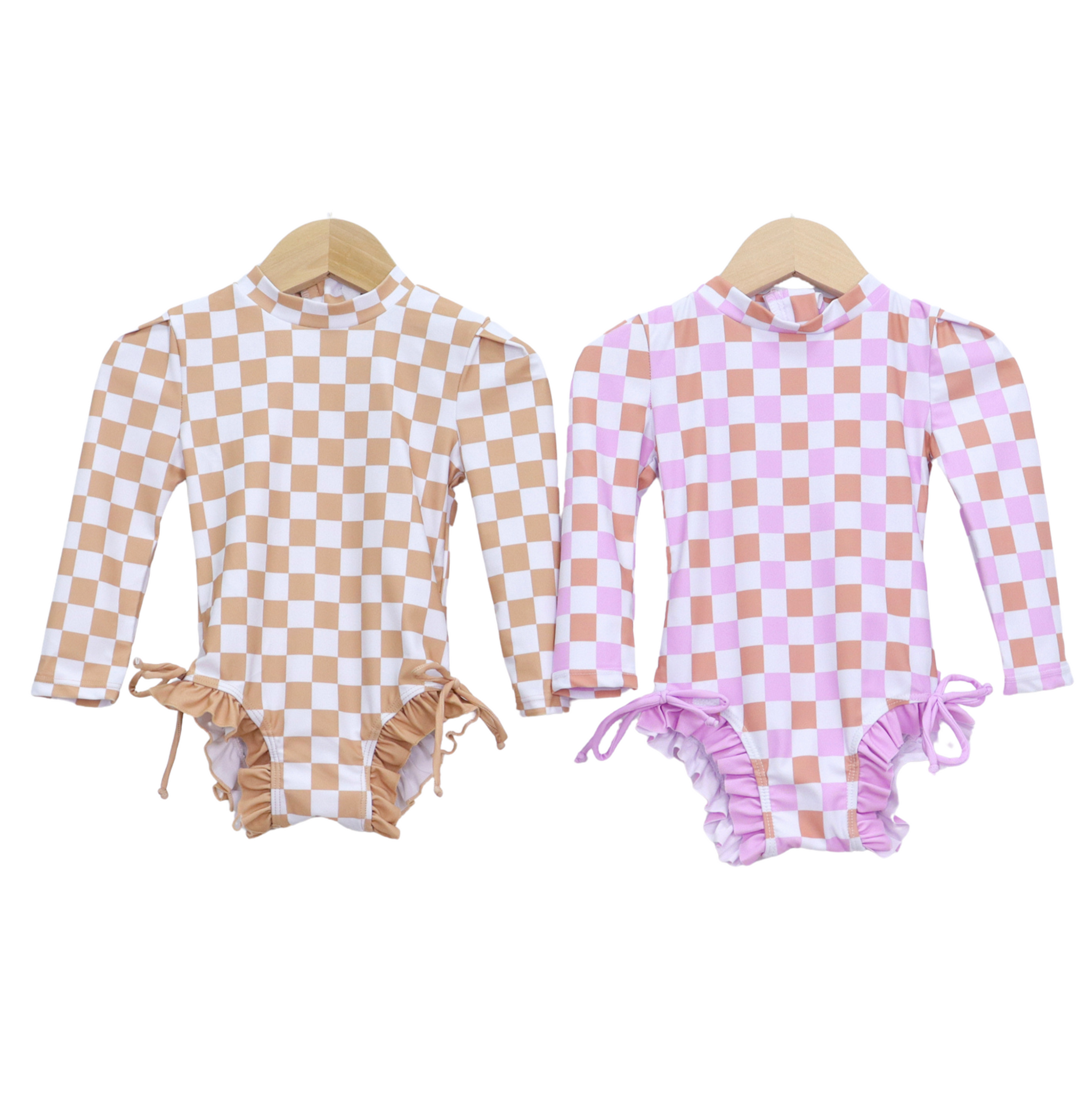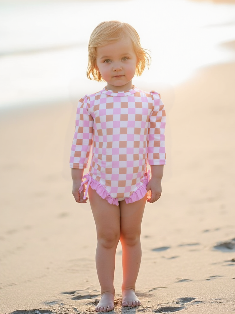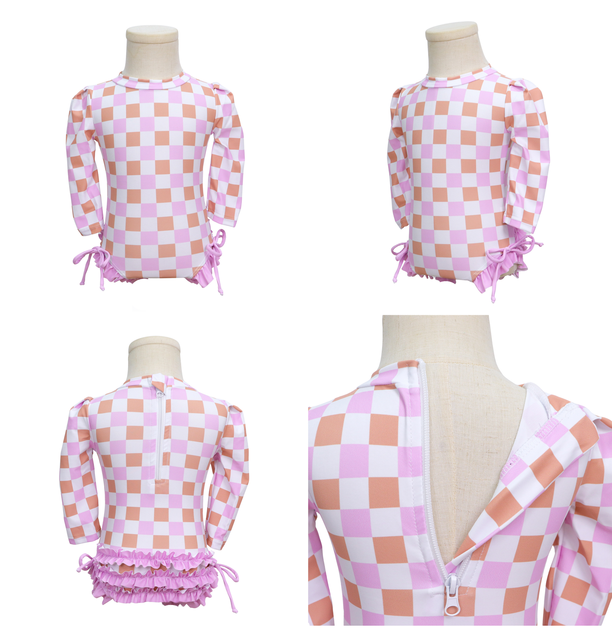 Badpak Lange Mouw Lila, Roze en Wit Geblokt met Ruches en Strikjes Meisjes