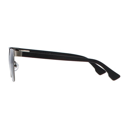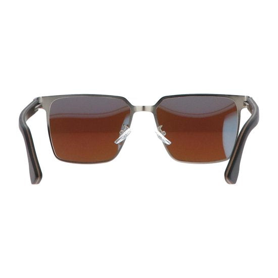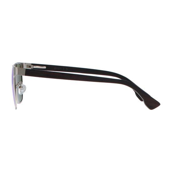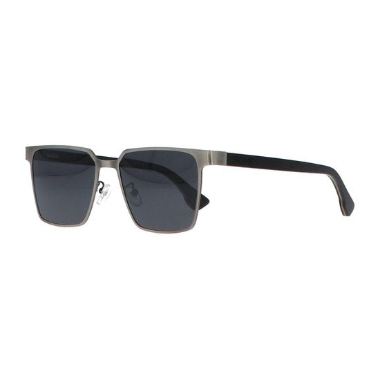 Sportief rechthoekig model zonnebril met metalen montuur in de kleur gunmetal en voorzien van grijze glazen en Ebbenhout houten pootjes. De poten zijn gemaakt uit meerdere lagen hout waarbij de middelste laag niet geverfd is voordat de lagen op elkaar gemonteerd zijn waardoor je een mooi zicht krijgt op de meerdere lagen hout. Doordat de lenzen zijn gepolariseerd, heb je veel minder last van schittering op water of glas.