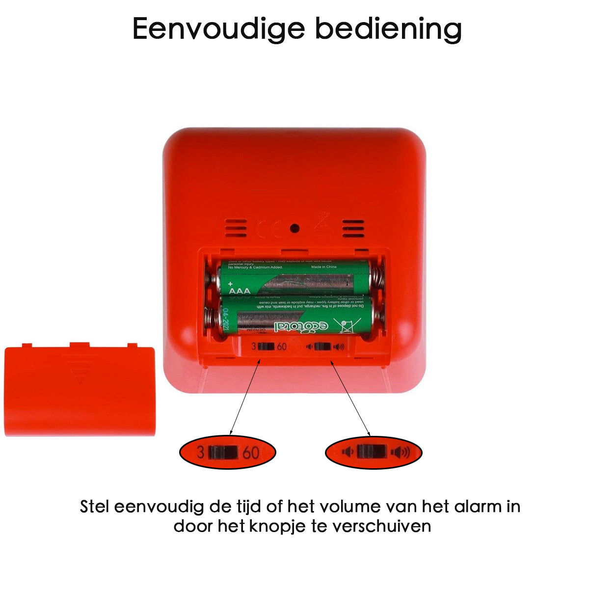 De timer is zeer gemakkelijk in te stellen. Door de witte knop naar rechts te draaien tot de gewenste tijd, stel je de timer in. Daarnaast is het mogelijk om het alarm voor 3 seconden of 60 seconden in te stellen en het volume van het alarm hard of zacht te zetten. Deze zijn afzonderlijk van elkaar in te stellen aan de achterkant van de timer wanneer het batterijklepje verwijderd is.