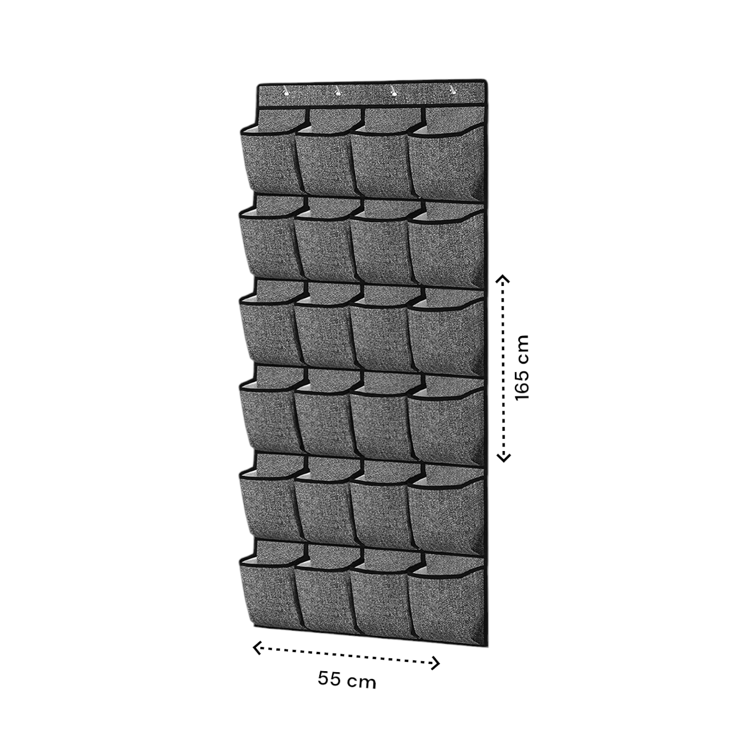 Deze schoenenzak kan met behulp van de deurhaken worden opgehangen aan de deur of in je kledingkast. De zak heeft 24 vakjes. Ideaal om je schoenen te beschermen tegen vuil, stof, vocht en bacteriën. Ook handig om sokken, kleding enz. op te bergen. Daarnaast biedt deze schoenenzak overzicht, zodat je ook de schoenen die je niet vaak draagt nooit uit het oog verliest.