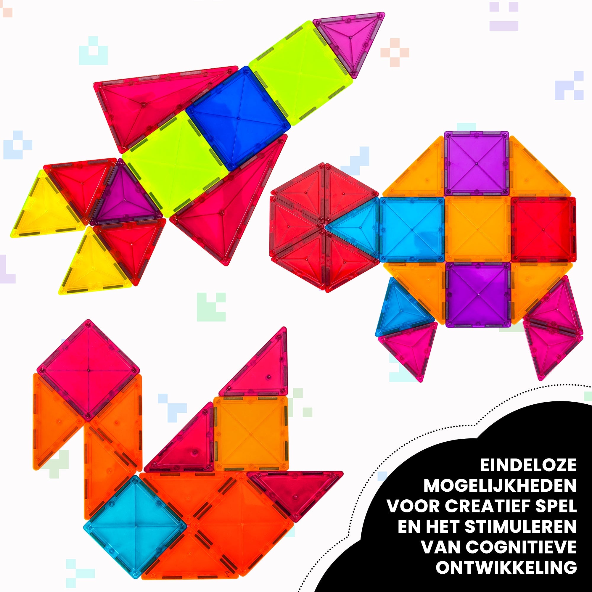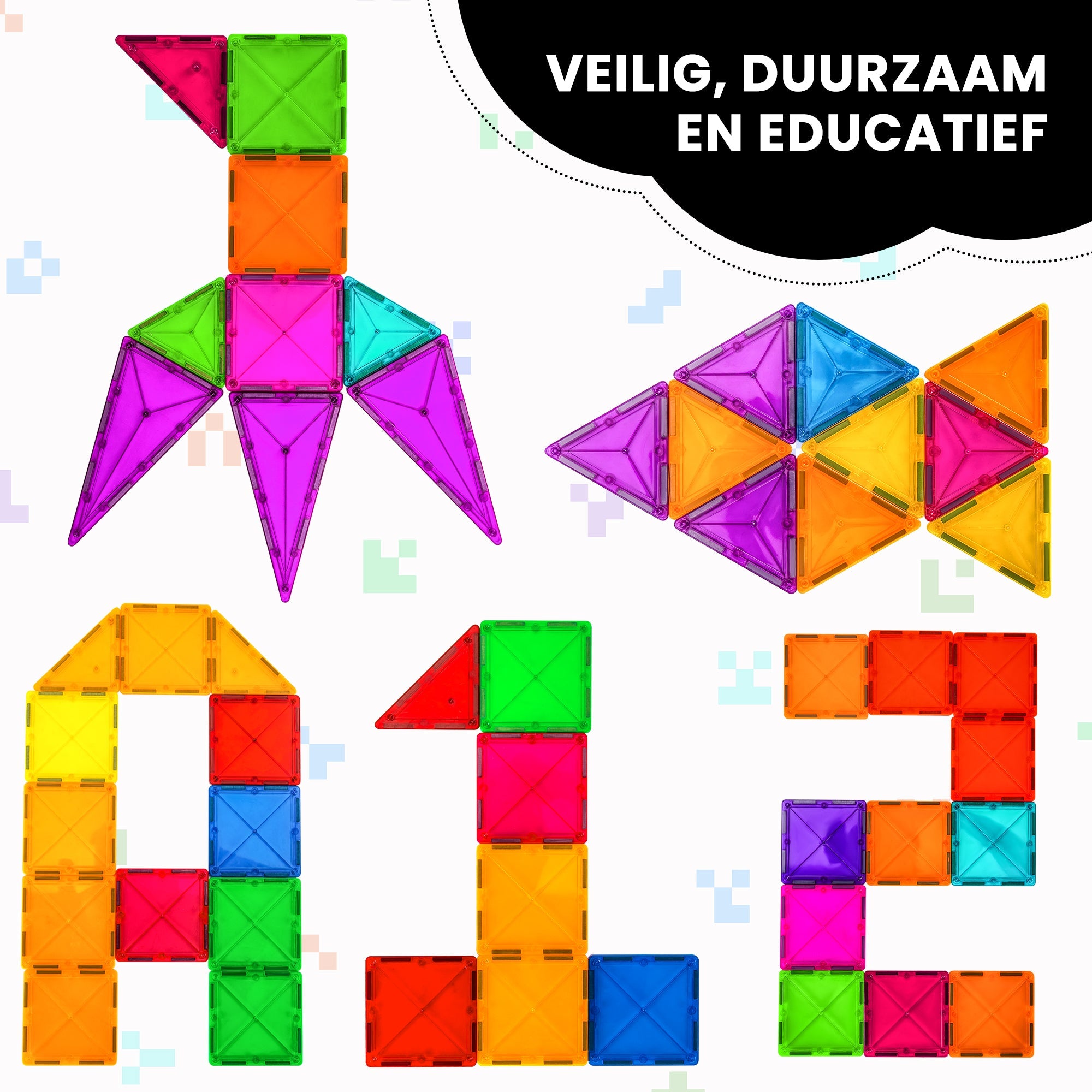 Dit magnetisch speelgoed is speciaal ontworpen voor jonge kinderen. De bouwstenen zijn groot genoeg om veilig vast te houden en zijn gemaakt van hoogwaardig, niet-giftig materiaal. Het product is CE-gecertificeerd en voldoet aan de hoogste veiligheidseisen, zodat jij als ouder met een gerust hart kunt toekijken hoe jouw kind met plezier en veiligheid speelt.
